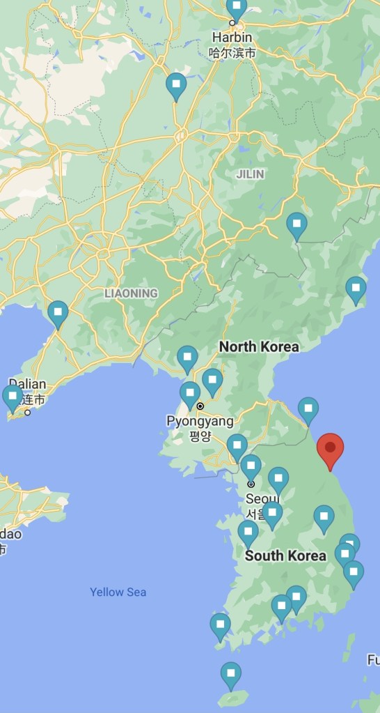77 Miles later we arrive at Ojukheon House in Gangneung where Confucian scholar Yi I was born on 26th December 1536. The house was built during the reign of King Jung-Jong (1506-1544) and was named after the black bamboo trees which surrounded it. It is now one of the oldest wooden residential buildings in Korea and was designated as national treasure no. 165 in 1963 for its historical value. It has been very well maintained by Yi I’s family through many generations and is a popular tourist attraction, now housing Mongryongsil (Yul-Gok’s Memorial Hall).