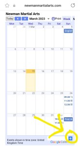 Make sure you keep up to date with upcoming events such as gradings, competitions, and any lesson cancellations via the Google Calendar near the bottom of our homepage. Did you know you can sync this with your mobile phone’s calendar? Simply click on the + symbol at the bottom.